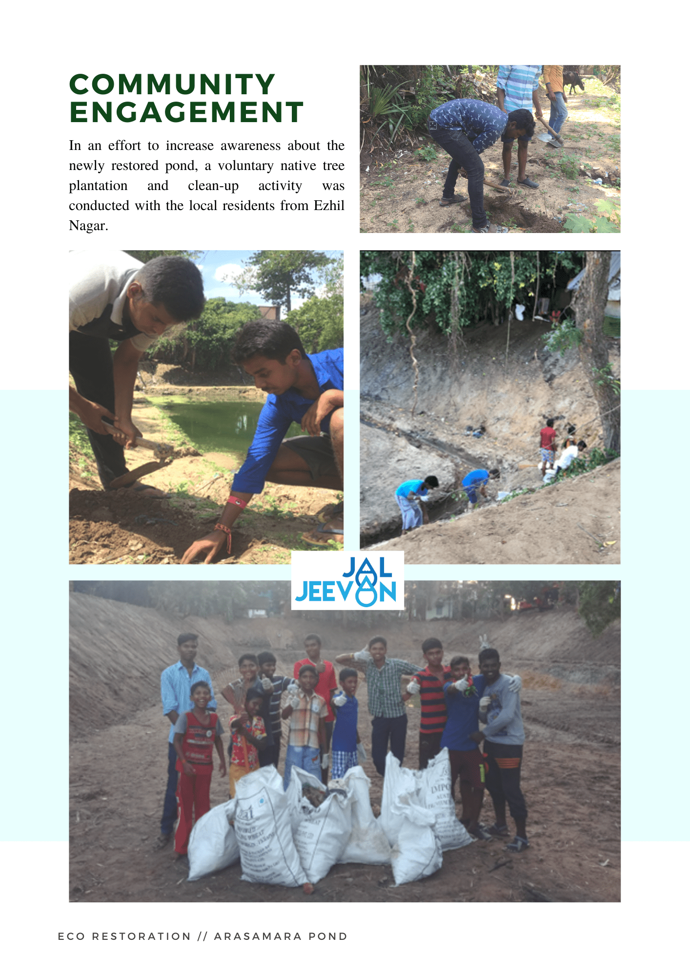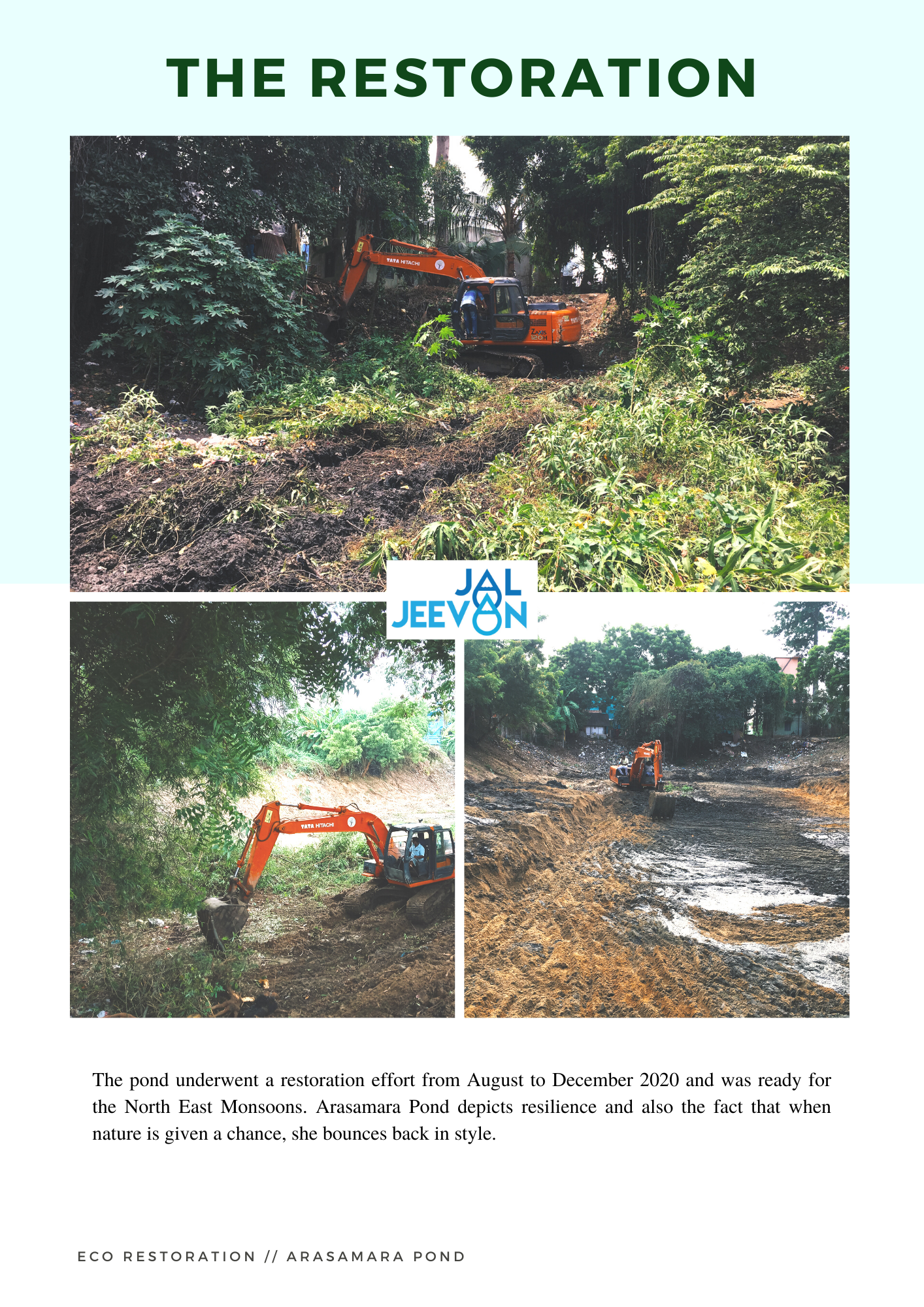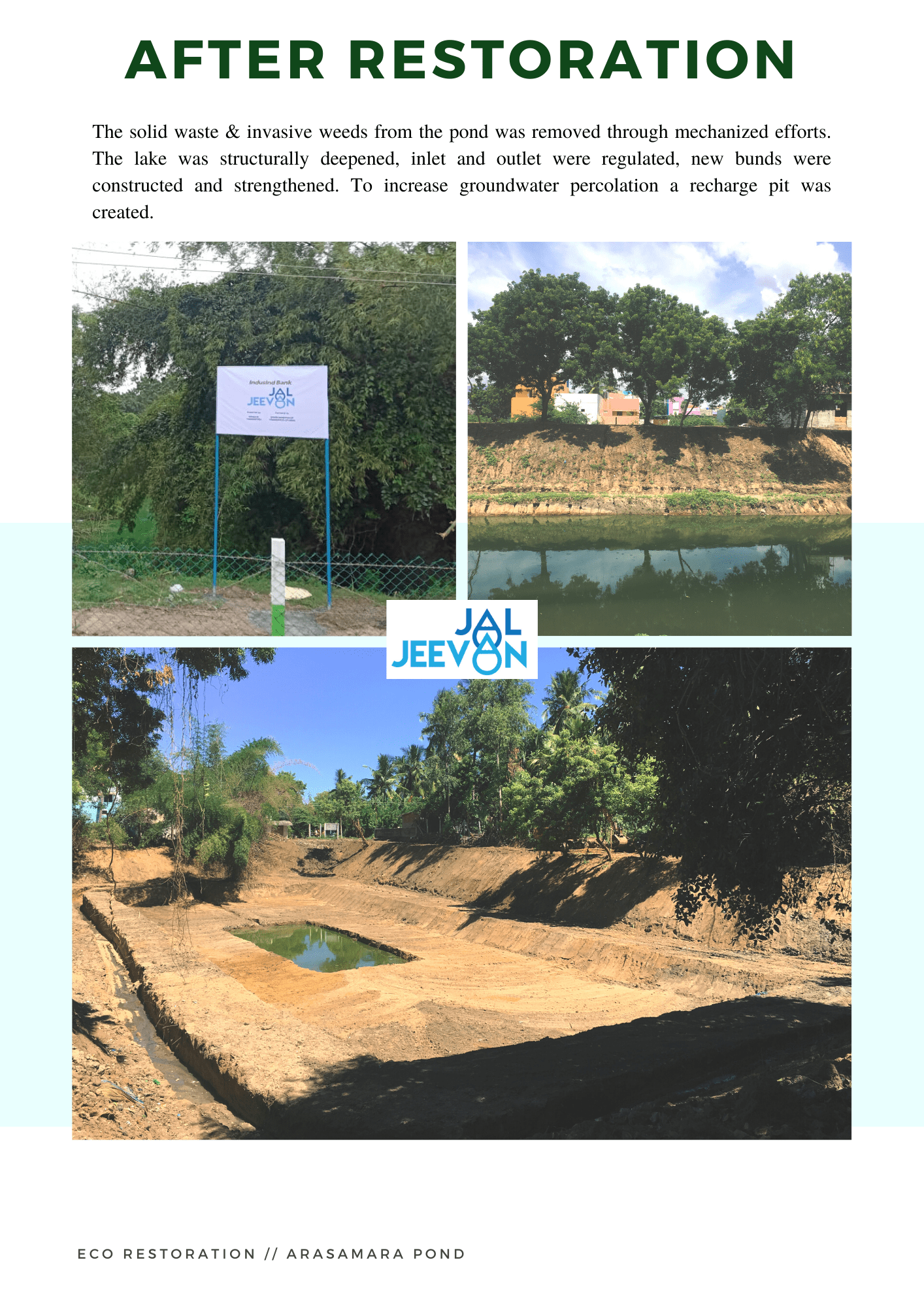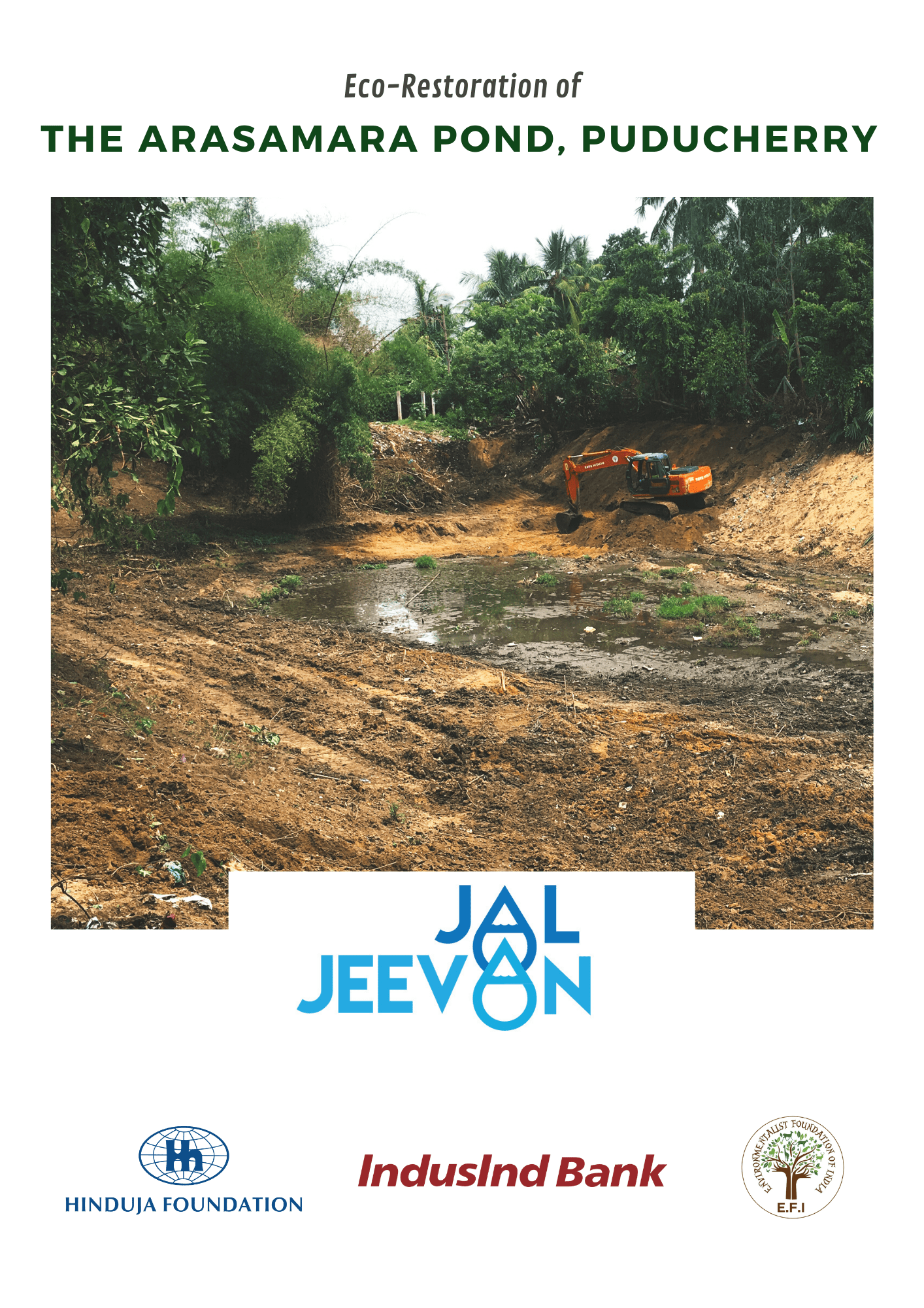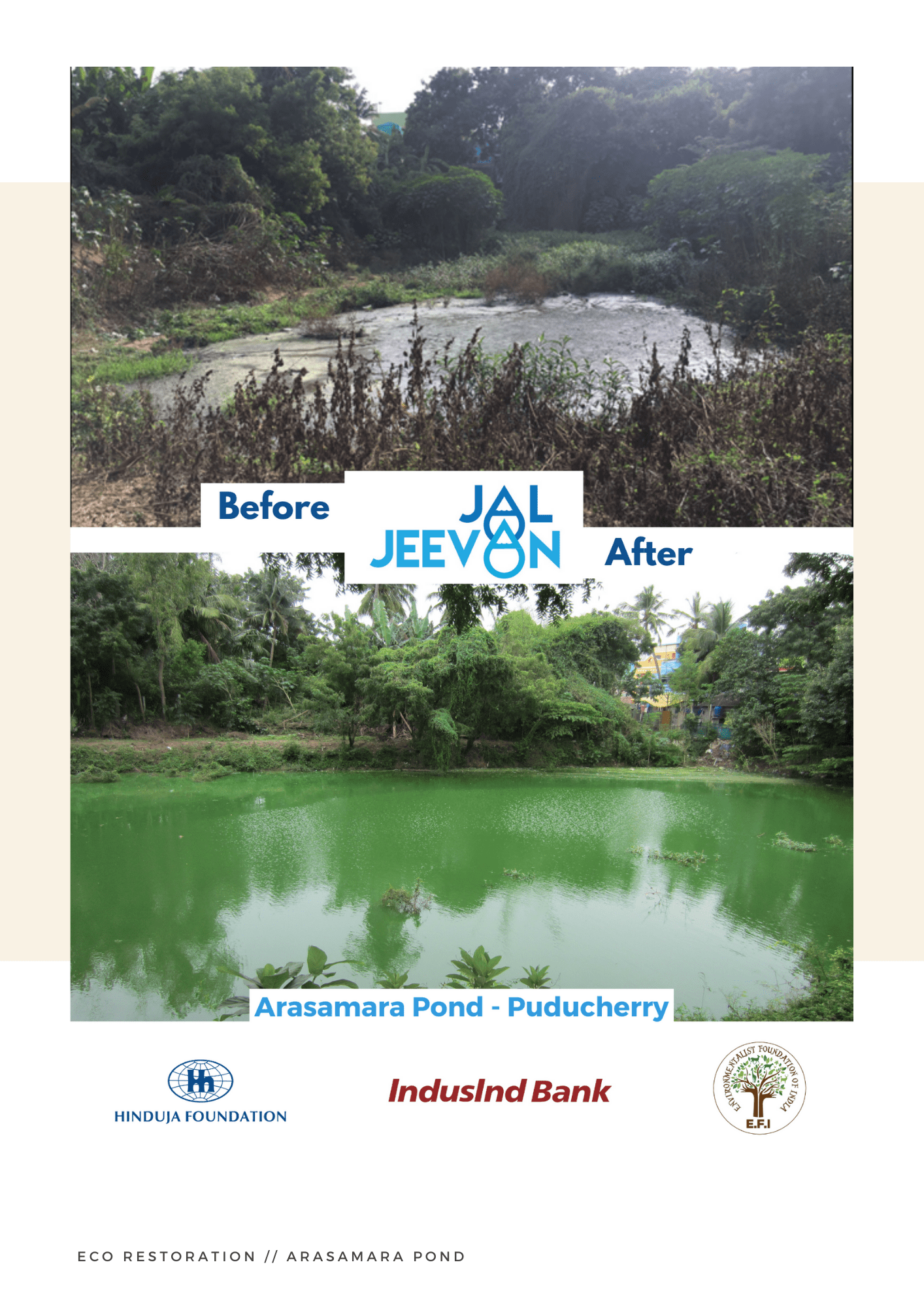 With administrative support form the Government of Puducherry, and funding support from the IndusInd bank, part of the HInduja Foundation under the Jal Jeevan initiative, E.F.I took on the restoration of the Arasamara Pond. Take a look at all that happened during the restoration!