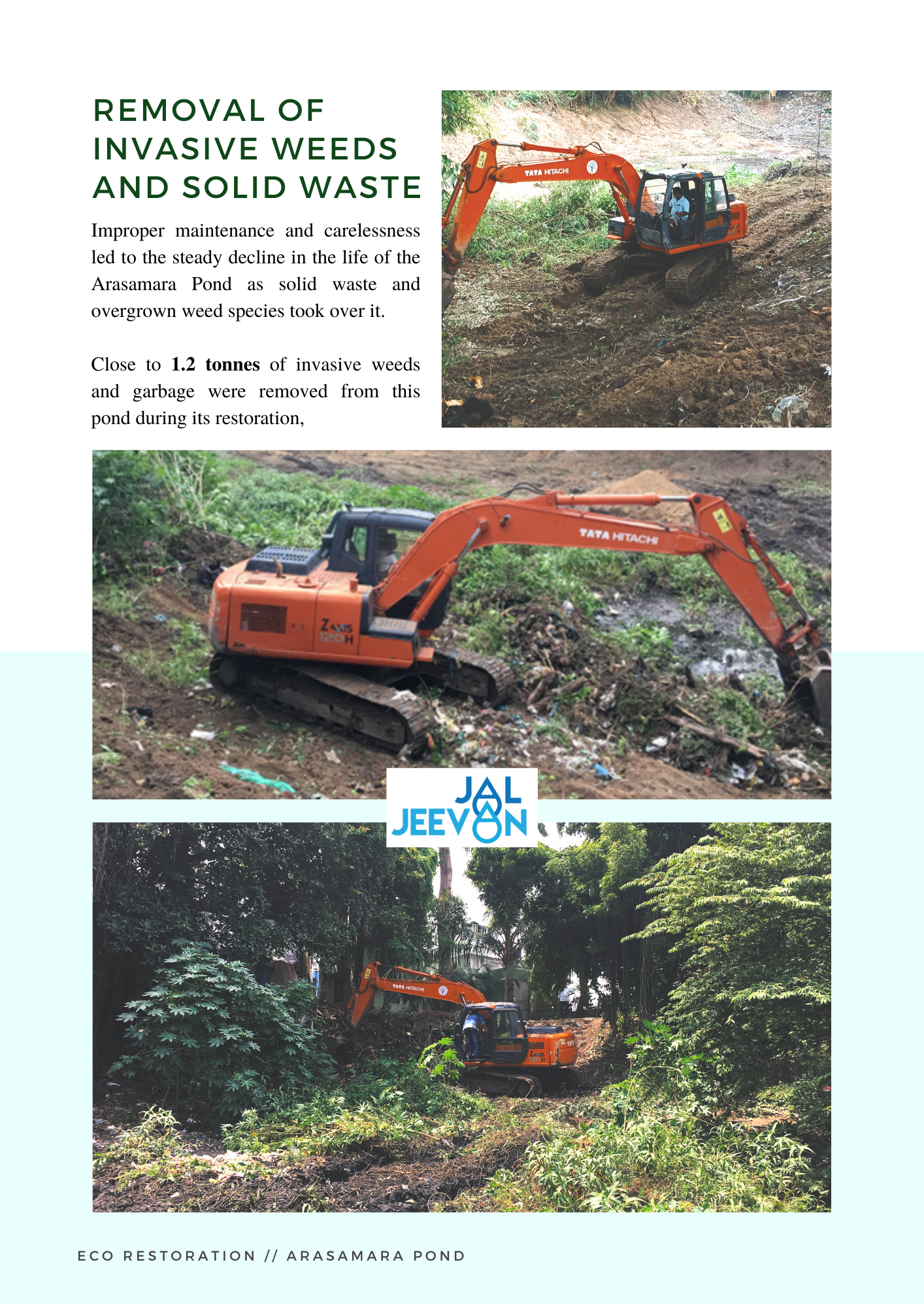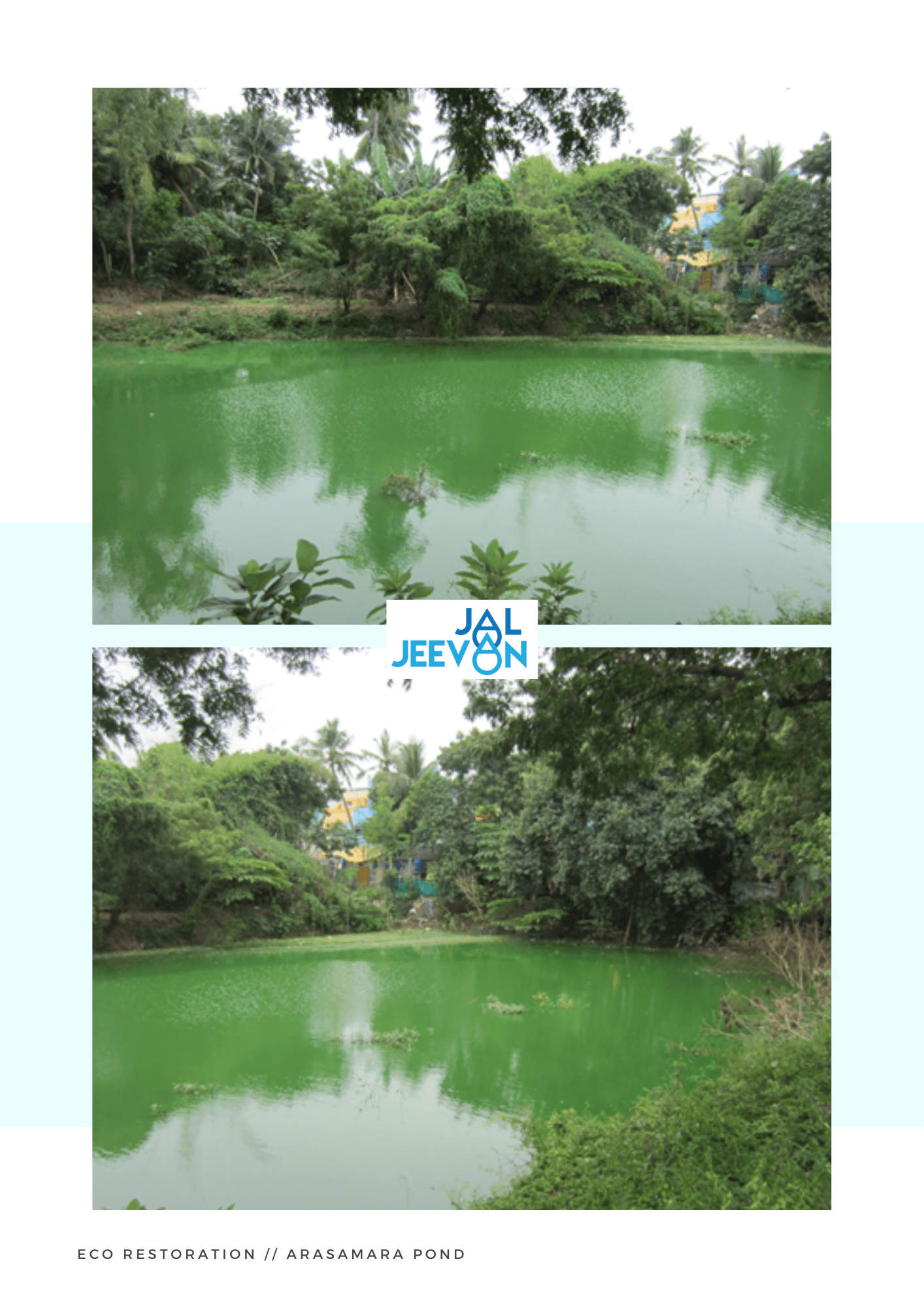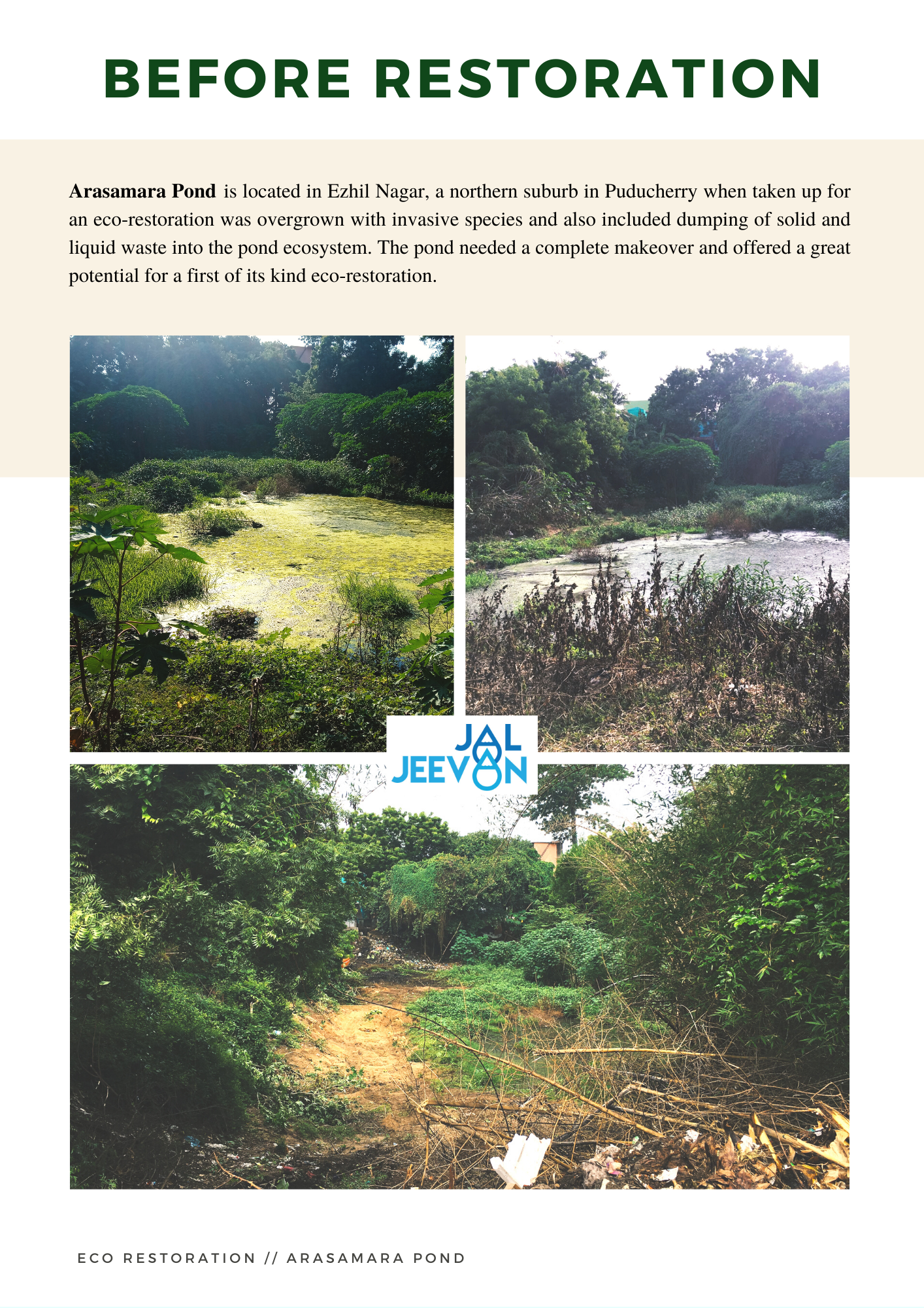 Arasamara Pond is located in Ezhil Nagar, a northern suburb in Puducherry get its name from the “peepal” tree on its northern bund. When taken up for an eco-restoration, the pond was overgrown with invasive species and also included dumping of solid and liquid waste into the pond ecosystem.